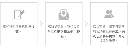 免除现场排队登记:现场凭登记确认信,即可换领参观证直接入场。 获得精美礼品:有机会参与展会现场抽奖活动,赢取精美礼品! 市场零距离:您将定期收到新闻通讯,随时掌握市场动态和企业资讯! 直击目标客户:您将有机会与目标客户洽谈预约,拓宽您的业务和人脉! 优先参加现场专题研讨会